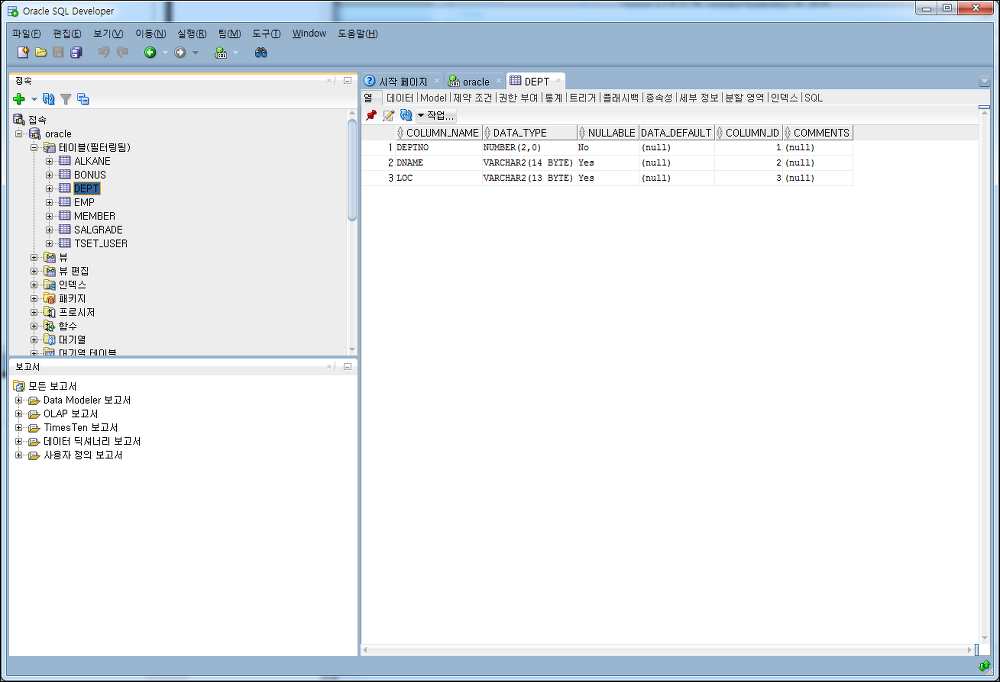 오라클에 있는 기본 계정인 scott 계정에 접속한 모습이다. 접속을 했다면 왼쪽 상단부분에 테이블, 뷰, 뷰편집 등 메뉴가 있을 것이다.
