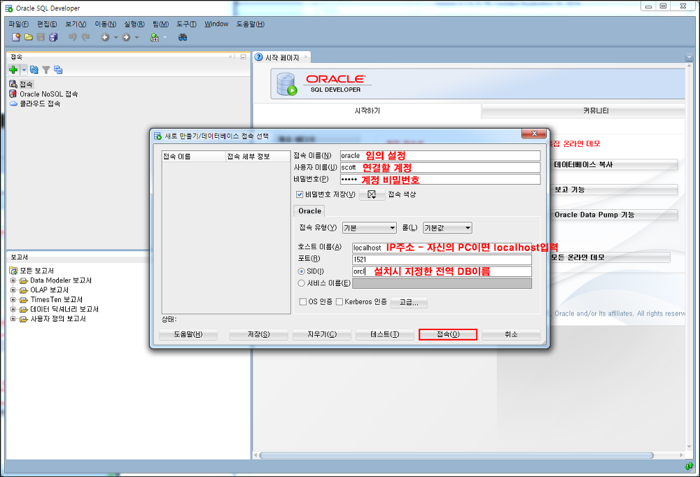 호스트 이름 : IP 주소를 입력한다. 자신의 PC에 오라클을 설치했다면 localhost를 입력, 아니라면 설치된 PC의 IP 주소를 입력한다.