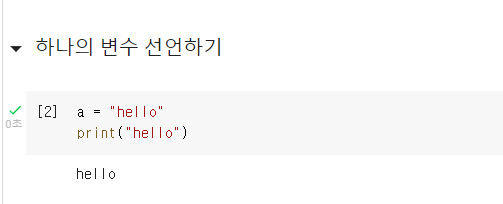 a에 hello 라는 변수를 삽입한 뒤에 print() 함수를 이용해서 출력해보면 hello가 출력이 됩니다.
