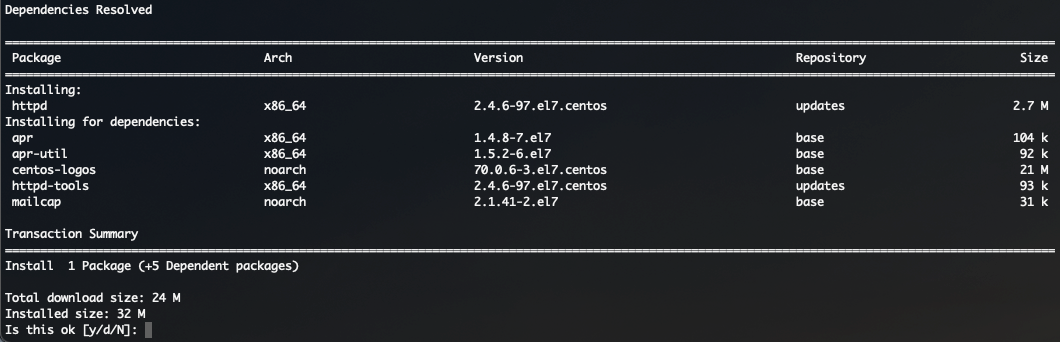 yum으로 설치하면 보통은 최신 버전이 설치된다. 특정 버전을 설치하려면 해당 repo를 yum에 등록해야 하는 번거로움이 있지만 설치에 필요한 apr, apr-util등이 자동으로 설치되어 매우 편하다.